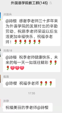 李世英老师1985年开始在外语学院工作,由电教室转至资料室,其后考上研究生,毕业后从行政人员转岗成为当时急需的专职英语教师,36年来,她育桃李,散芬芳,把自己的青春贡献给了外院,她以优雅的气质与学识感染教育了无数师生,深受大家的喜爱。全院教职员工除了用鲜花和掌声向李老师表示感谢外,大家还在学院教工群中,纷纷为李老师的退休生活送上美好祝愿,祝福李老师荣退后开启更加精彩的人生。