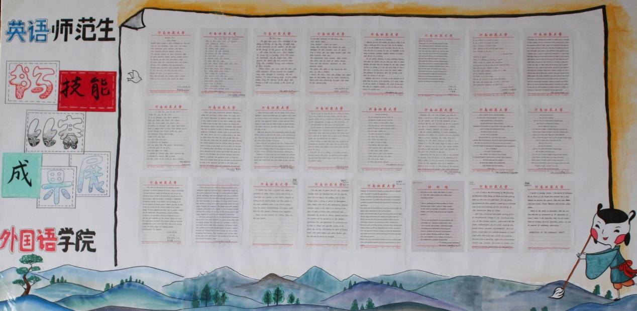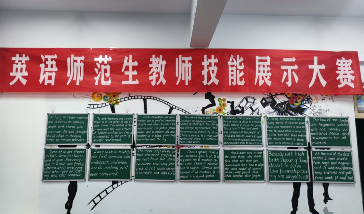 本次参赛作品均采用专业语种书写,分为硬笔字和粉笔字两种展示形式,学生们对两种赛式均表现出极大的热情。学生认真准备书写作品,用字迹展现自我风采,全力投入、精心书写,秀钢笔之遒健,展粉笔之隽永,抒写师大风采。本次比赛最终挑选出优秀作品在外国语学院进行展出,以此鼓励学院学子以优秀作品为榜样,培养良好书写习惯。