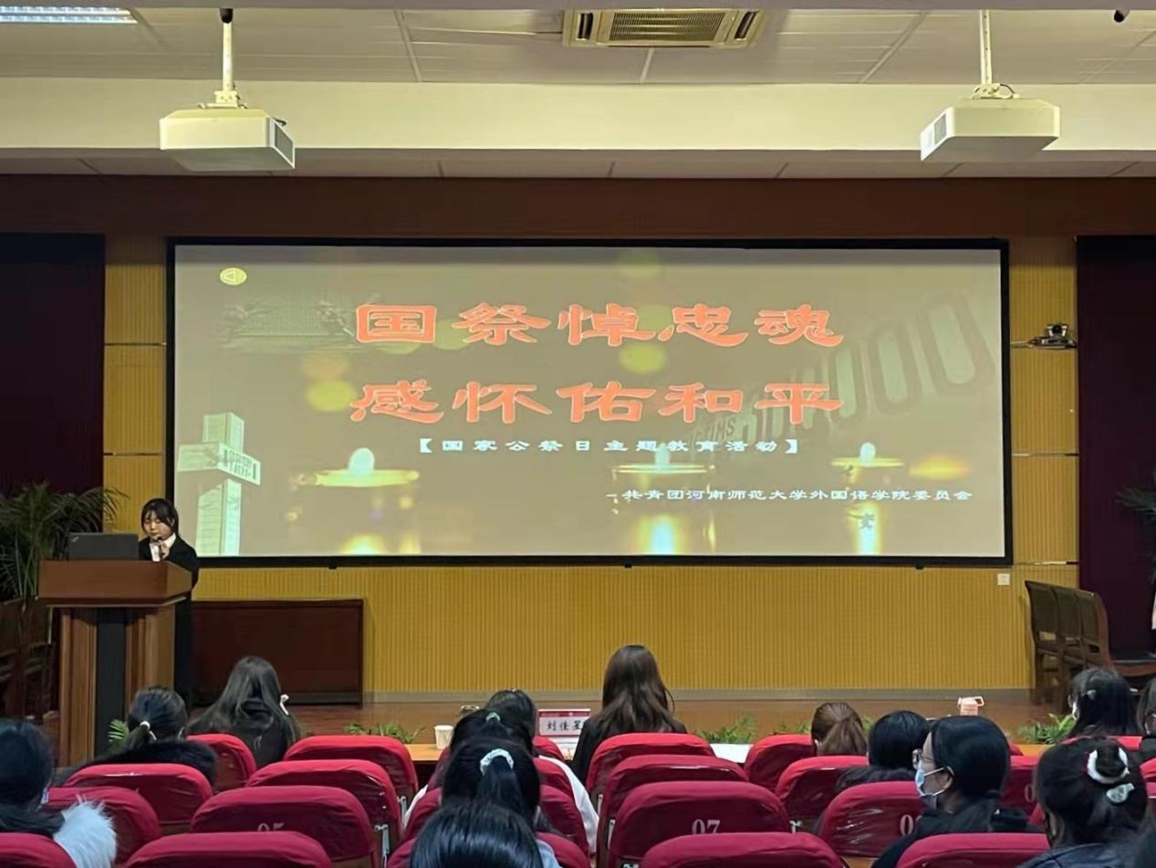 为悼念在南京大屠杀中遇难的三十万同胞,弘扬爱国主义民族精神,厚植青年学生的爱国情感,12月12日晚,外国语学院团委于学院报告厅举办“国祭悼忠魂,感怀佑和平”活动。院团委老师刘佳星及21级学生代表参与其中。