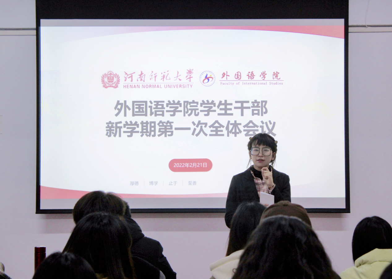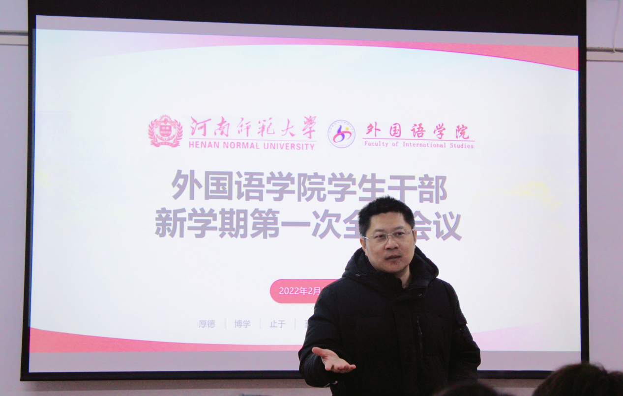 为提高学生干部的工作能力、更好地开展学生工作,2月21日晚,外国语学院于学院行政楼二号多媒体教室举行学生干部新学期第一次全体会议。学院党委副书记曹崇出席会议,全体学生干部参与会议。会议由团委书记刘佳星主持。