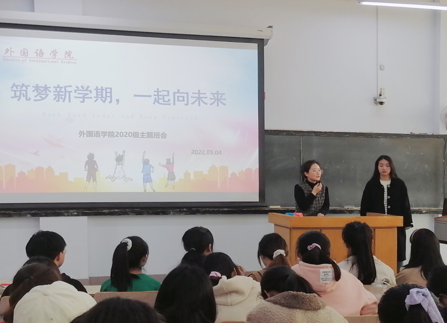 新学期,新气象,新作为。为积极响应党委学工部、学生处开展“筑梦新学期·一起向未来”主题班会的号召,帮助同学们树立新目标,拥抱新学期,3月3日中午,外国语学院2020级于求是中楼召开主题会议。外国语学院2020级专职辅导员彭典范,兼职辅导员程蓓蓓、张莫晗以及2020级全体学生参加。