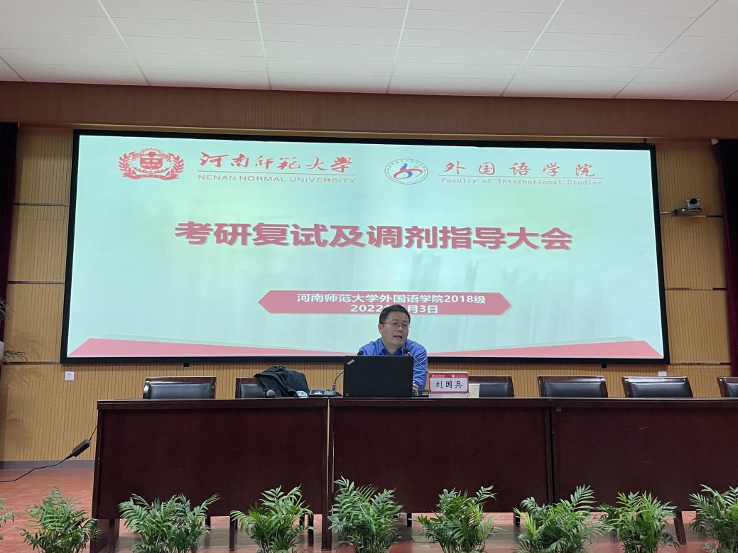 为进一步做好我院2022届毕业生考研复试及调剂工作,我院院长刘国兵教授于3月3日晚在外国语学院报告厅为2022届英语、日语、法语、翻译专业本科毕业生做考研复试及调剂专题讲座。讲座由辅导员张良主持,学院党委副书记曹崇出席。