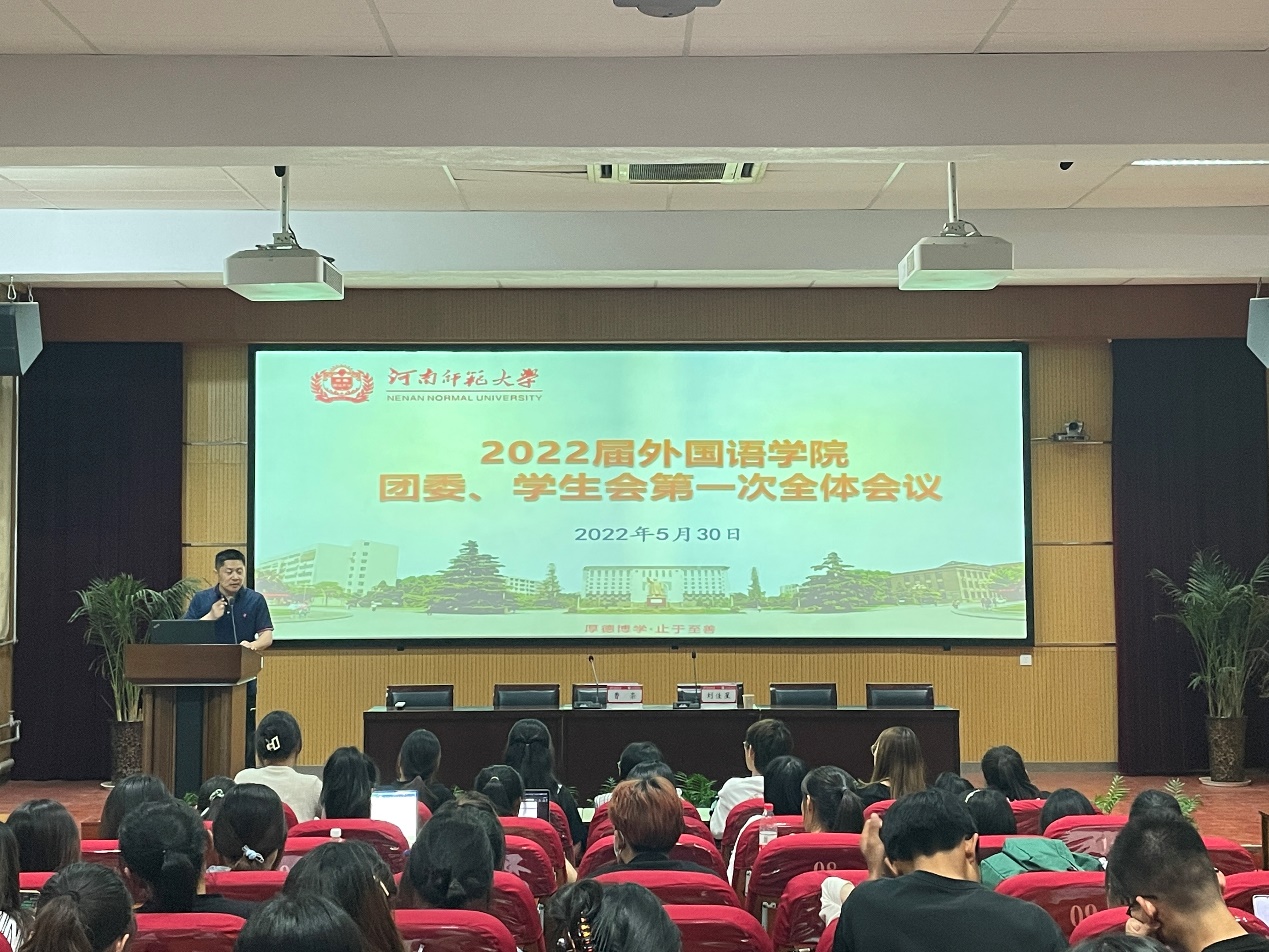 为加强学院团委学生会学生干部的责任意识,明确初心使命,增强团队凝聚力,5月30日晚,外国语学院于学术报告厅召开2022届团委学生会第一次全体会议,党委副书记曹崇出席本次会议,团委老师刘佳星担任会议主持人,团委学生会全体成员均准时参会。
