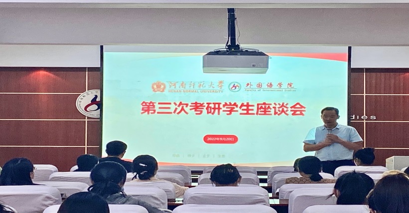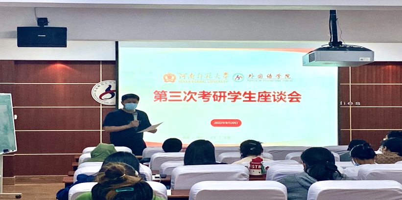 9月20日下午,外国语学院在学院国培教室举办第三次考研学生座谈会,学院党委副书记曹崇、学院副院长张军民、2019级专兼职辅导员、优秀考研学生代表和30名本科生参加会议。会议严格按照相关疫情防控要求,参会人员佩戴口罩,隔位落座。会议由兼职辅导员张闪闪主持。