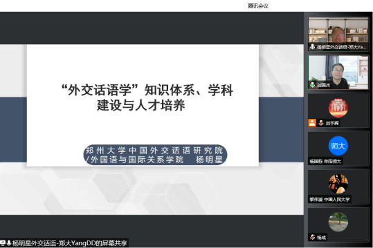10月25日,应外国语学院邀请,国家社科基金重大项目首席专家及评审专家、郑州大学中国外交话语研究院院长杨明星教授在线作了题为“‘外交话语学’的知识体系、学科建设与人才培养”的学术报告。学院300余名师生参会学习。报告由外国语学院院长刘国兵教授主持。