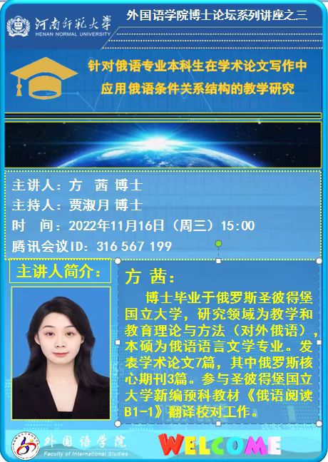 【预告】外国语学院博士论坛系列讲座:针对俄语专业本科生在学术论文写作中应用俄语条件关系结构的教学研究 方茜 博士