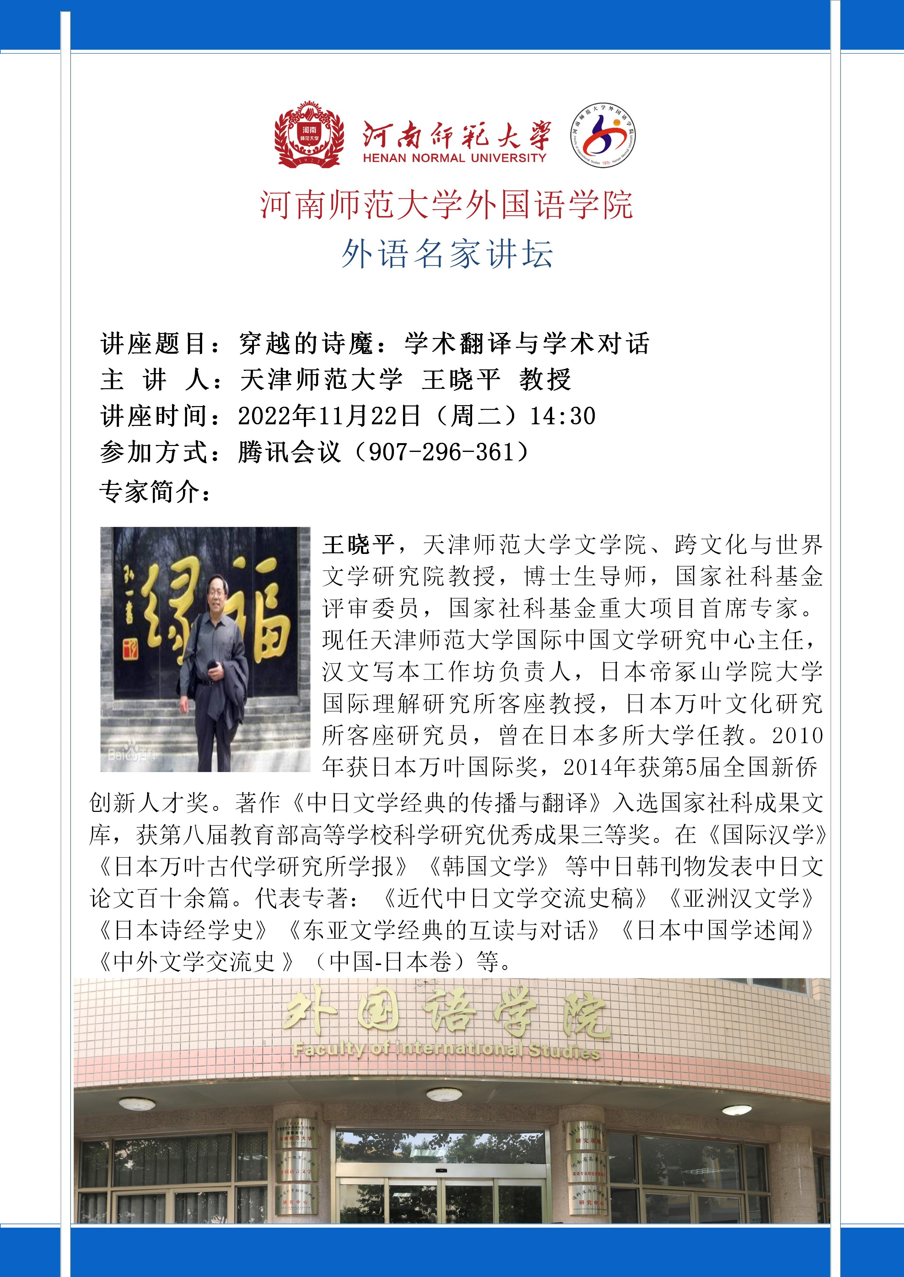 【预告】外语名家讲坛:穿越的诗魔:学术翻译与学术对话 天津师范大学 王晓平 教授
