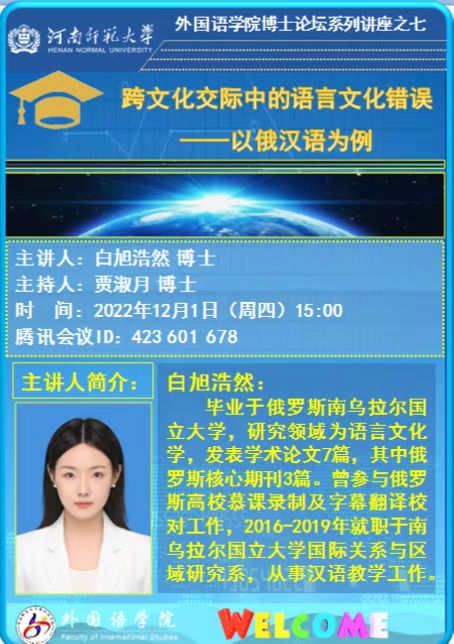 【预告】外国语学院博士论坛系列讲座:跨文化交际中的语言文化错误——以俄汉语为例 白旭浩然 博士