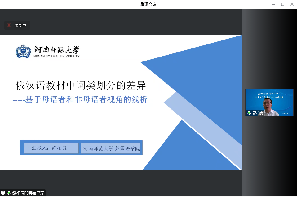 为促进学院内部学术交流,加速经验传递和增进学院教师学术水平,11月29日,外国语学院青年教师博士论坛系列讲座第六讲如期举行。学院新引进教师静柏良博士在线作了题为“俄汉语教材中词类划分的差异——基于母语者和非母语者视角的浅析”的学术讲座。百余名校内师生及省内外部分兄弟院校师生参会聆听。讲座由白旭浩然博士主持。