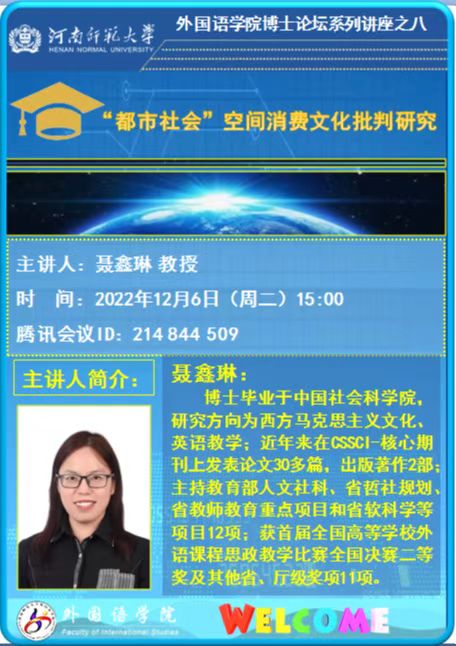 【预告】外国语学院博士论坛系列讲座:“都市社会”空间消费文化批判研究 聂鑫琳 教授
