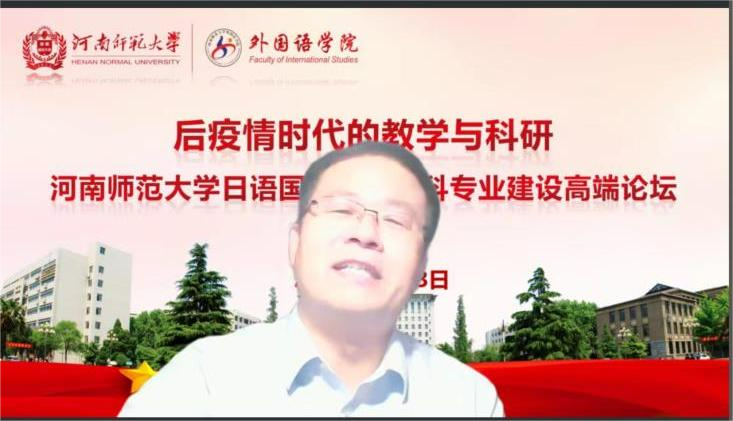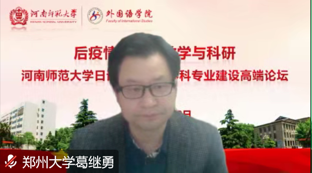 郑州大学亚洲研究院执行院长、河南省特聘教授、教育部日语专业教学指导委员会委员、浙江大学文学博士、日本早稻田大学博士后、博士生导师葛继勇教授作了题为“河南省日语专业建设现状与发展展望”的主旨发言。关于河南省日语专业建设现状与发展展望,他围绕四点展开:一是国家一流专业与新文科建设背景,二是河南省高校日语专业面临的问题和解决方案,三是郑州大学日语专业教学科研工作积淀回顾,四是郑州大学日语专业今后的工作具体思路。
