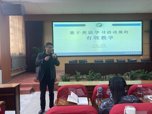 李哲老师以自身教学经历为例,介绍了自己对英语学习活动观的理解,指出支架式教学和教学评一体化是落实英语学习活动观的有效手段。实施有效教学应妥善处理教学中多与少,快与慢,讲与练,学与教的关系。他提出,对学情、语篇和学习目标进行详尽的分析是进行教学设计的必要准备工作。通过此次报告,学院师生对英语学习活动观指导下的有效教学有了清晰的认知,拓宽了学术视野,启迪了科学思维。