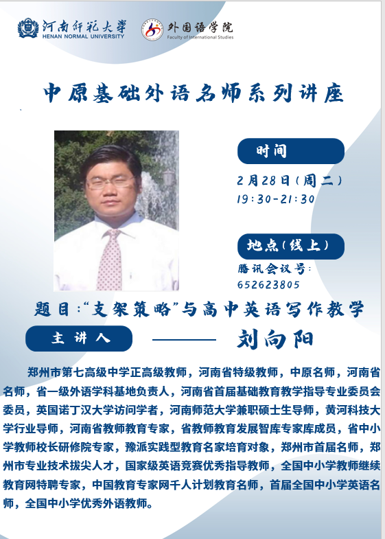 中原基础外语名师系列讲座(预告):"支架策略"与高中英语写作教学—郑州市第七高级中学刘向阳