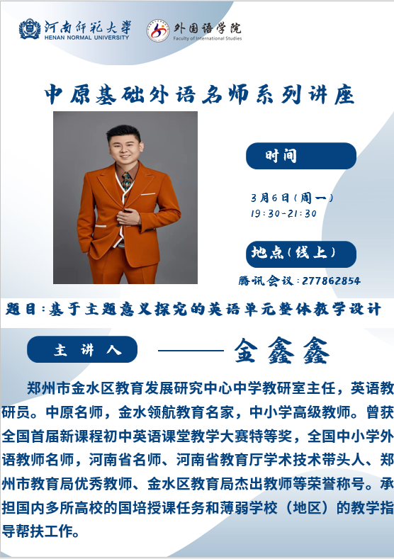 中原基础外语名师系列讲座(预告):基于主题意义探究的英语单元整体教学设计—郑州市金水区教育发展研究中心—金鑫鑫