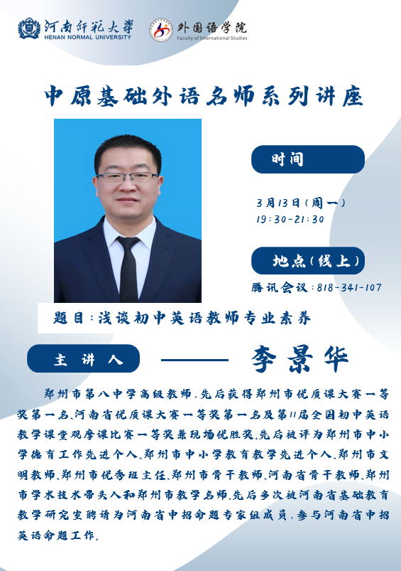 中原基础外语名师系列讲座(预告):浅谈初中英语教师专业素养—郑州市第八中学李景华