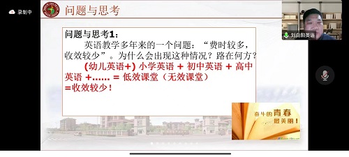 2月28日,应外国语学院邀请,中原名师、河南省名师、河南省教师教育专家、河南省特级教师刘向阳老师通过腾讯会议作了“支架策略与高中英语写作教学”的线上学术讲座。讲座由于浩鹏教授主持,我院部分教师、教育硕士研究生90余人聆听了此次讲座。