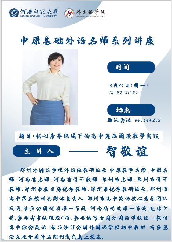 中原基础外语名师系列讲座(预告):核心素养视域下的高中英语阅读教学实践—郑州外国语学校智敬谊