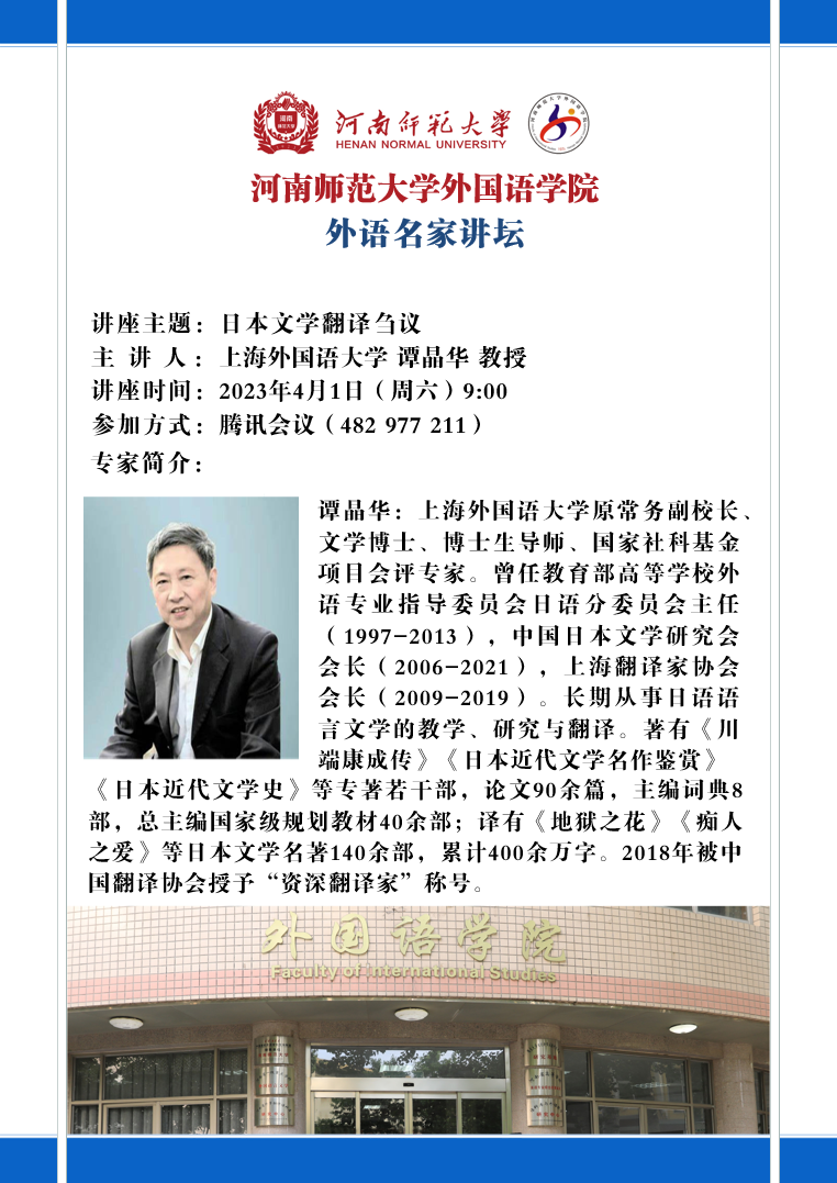 【预告】外语名家讲坛:日本文学翻译刍议 上海外国语大学 谭晶华 教授