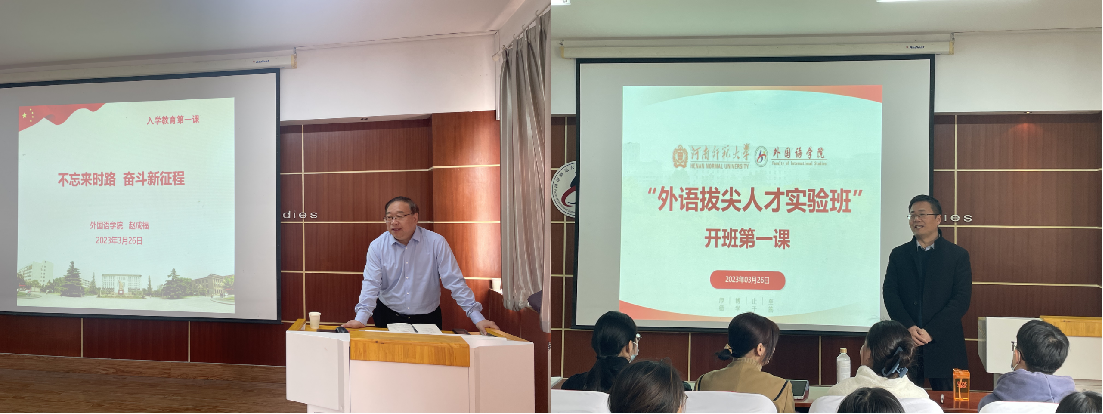 2023年3月26日上午,外国语学院于国培教室开展“外语拔尖人才实验班”开班思政第一课,外国语学院党委书记赵成福、院长刘国兵担任讲课教师,全体“外语拔尖人才实验班”学员参加本次培训。