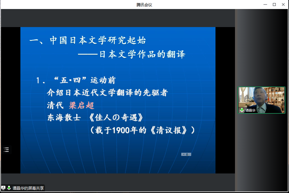 谭晶华从“中国的日本文学翻译简史”“莫言与村上春树的文学翻译”“四十年从事文学翻译的心得”“中国文化走向世界的文学翻译问题”等四个层面,多角度讲解了日本文学翻译方法论及其纷争等问题,重点论述了中国文学外译中的“译什么?”“谁来译?”“可译性”等重要理论问题。他指出,当代文学翻译在力求达到“信达雅”等传统标准的基础上,还应该注重翻译在跨文化交际中的重要作用。报告结束后,他和参会师生进行了互动与答疑。通过此次报告,聆听者对宏观视野下的日本文学翻译有了清晰的认知,拓宽了学术视野,启迪了科学思维。