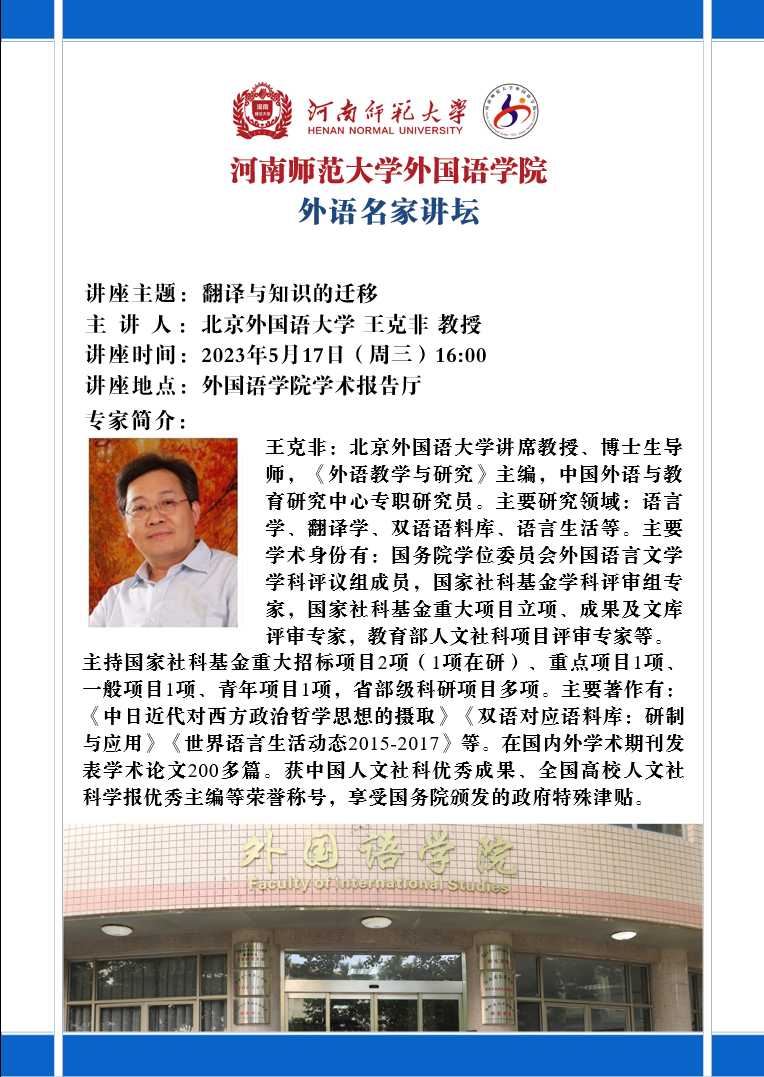 【预告】外语名家讲坛:翻译与知识的迁移 北京外国语大学 王克非 教授