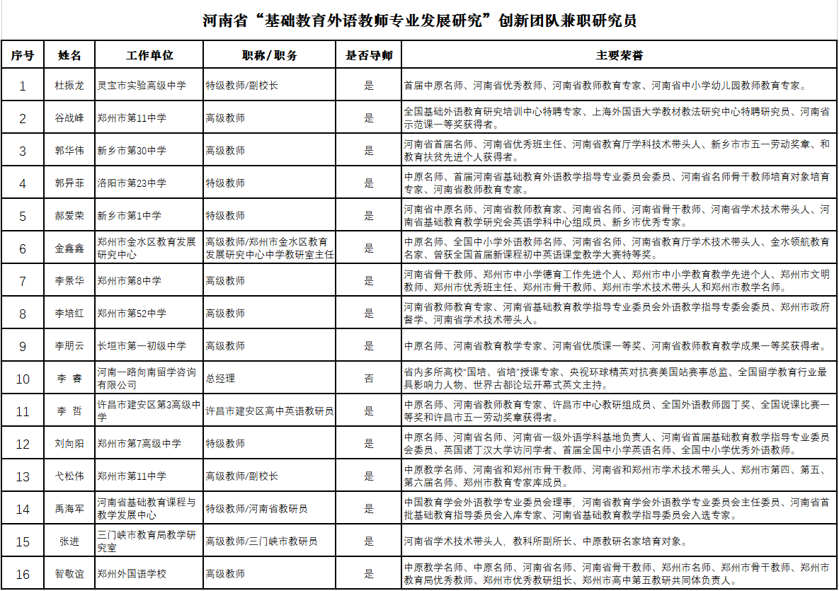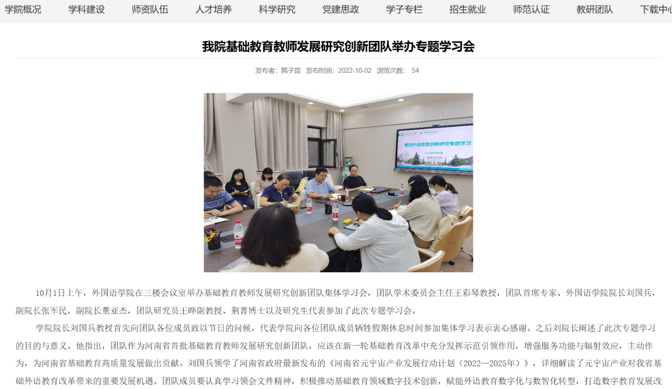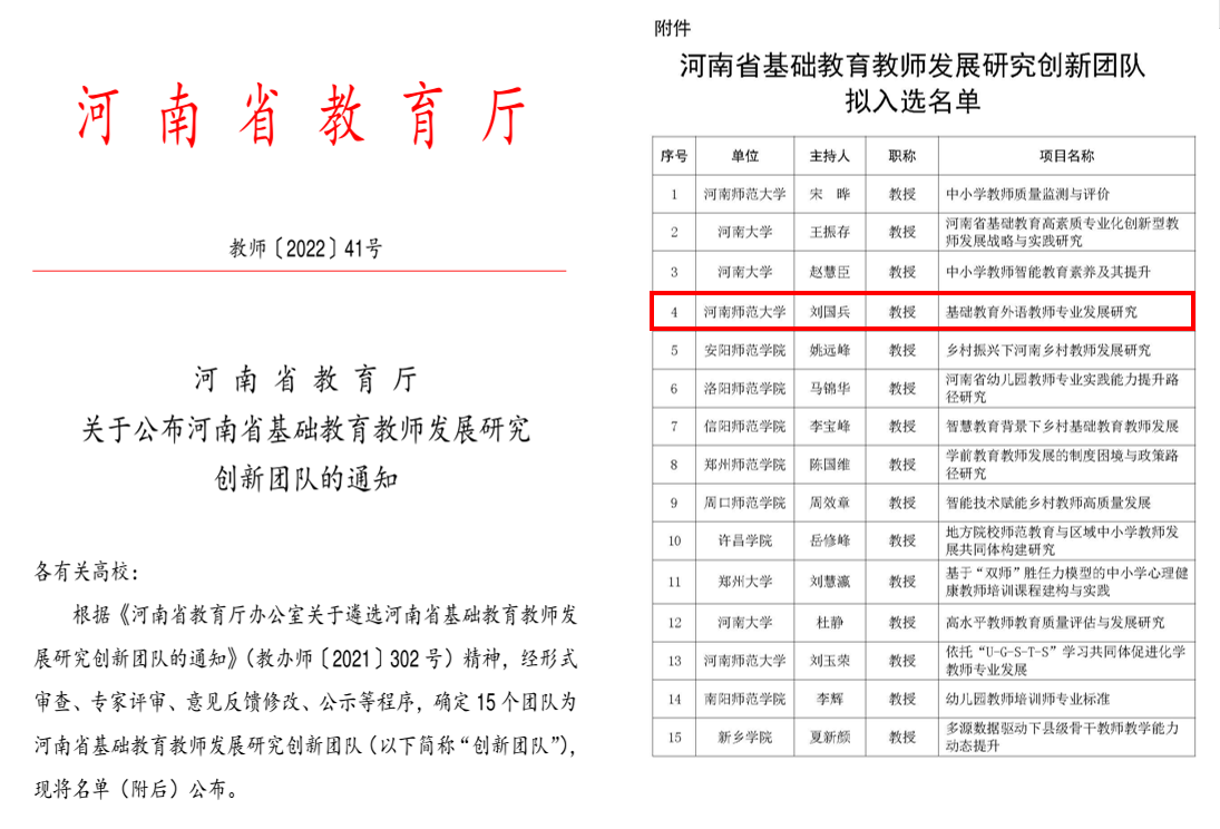 2022年3月,河南省教育厅发布了《关于公布河南省基础教育教师发展研究创新团队的通知》(教师〔2022〕41号),外国语学院院长刘国兵教授为首席专家申报的“基础教育外语教师专业发展研究”创新团队项目获批立项。这是我院在省部级教学团队建设方面的又一重大突破。