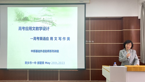 5月26日,应外国语学院邀请,中原名师、省特级教师、新乡市第一中学正高级教师郝爱荣老师在外国语学院国培教室作了“高考应用文写作教学设计”的学术报告。报告由刘丽娟副教授主持,我院部分教师、教育硕士研究生80余人聆听了此次讲座。