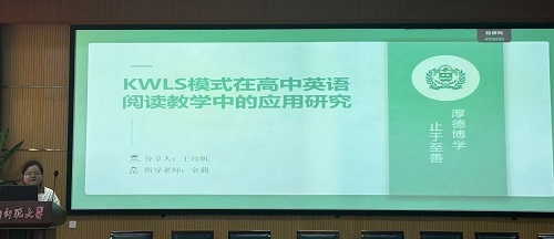 论坛伊始,7位研究生陆续分享了自己关于英语教学的研究成果和创新教学实践反思。王祎帆同学以《KWLS模式在高中英语阅读教学中的应用研究》为题,分享了KWLS模式在提升高中生英语阅读能力方面的显著效果。她指出,KWLS模式通过“已知—想知—新知—分享/仍想知”的教学流程,有效地激发了学生的阅读兴趣和探究欲望。王祎帆同学的研究强调了以学生为主体的教学理念,促进了学生主动阅读习惯和自主探究能力的培养。她的分享为高中英语教师提供了新的教学策略,有助于提升学生的英语阅读能力和批判性思维。