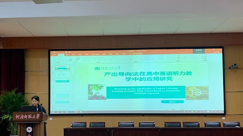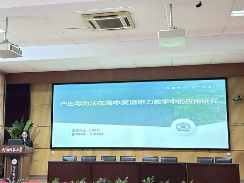 论坛伊始,7位研究生陆续分享了自己关于英语教学的研究成果和创新教学实践反思。张静云同学以《产出导向法在高中英语听力教学中的应用研究》为题,分享了POA对高中生听力能力的影响,以及对学生学习态度的影响。她强调,在新高考政策背景下提升学生听力理解能力的重要性,并探讨了POA理论体系在教学实践中的应用,旨在通过实验研究验证POA在提高学生英语听力成绩和学习态度方面的有效性。