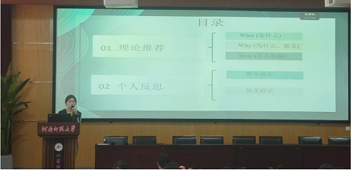 张淑玉同学分析了一篇以《基于英语学习活动观的阅读教学对学生思维品质影响的行动研究》为题的行动研究报告。张淑玉同学基于此行动研究进行了汇报,探讨了在初中英语阅读教学中实施英语学习活动观对学生逻辑性、批判性和创新性思维能力的影响,通过问卷调查、访谈、测试和课堂观察等方法,发现这种教学方法能显著提升学生的思维品质和阅读成绩,并提出了教学启示和研究的局限性。汇报结束后,她提出了自己的疑问以及日后自己的研究方向,姜士昌老师基于此给出了切实可行的建议和指导。