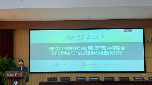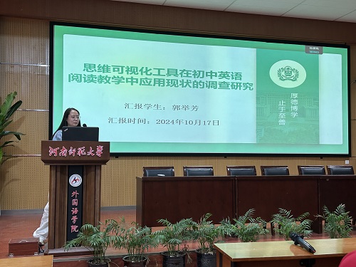 论坛伊始,7位研究生陆续分享了自己关于英语教学的研究成果和创新教学实践反思。郭举芳同学以《思维可视化工具在初中英语阅读教学中应用现状的调查研究》为题,探讨了思维可视化工具在提升初中生英语阅读能力中的应用与效果。她指出,通过将思维可视化工具融入英语阅读教学,可以有效提高学生的思维品质和语言理解能力。郭举芳同学的研究强调了以学生为中心的教学理念,提倡教师设计互动性强的课堂活动,激发学生的学习兴趣和探究精神。
