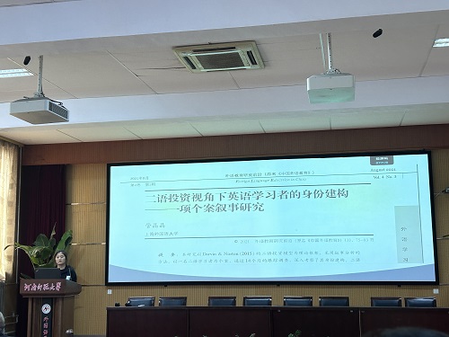 胡秋艳同学汇报了一篇以《二语投资视角下英语学习者的身份建构》为题的个案叙事研究报告。她探讨了在二语习得社会文化学派视角下,中国英语学习者如何通过语言学习和实践活动投资建构个人身份,以李明的案例分析了学习者如何利用语言资本兑换实践机会,以及这一过程对其身份建构的影响,提出了外语教育应关注学习者的社会属性和内在需求,提供丰富的实践资源,引导学习者进行全面的语言学习投资,并培养学生的家国情怀和国际视野。