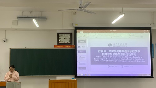余淇淇同学以《问题链应用于高中英语阅读课中的行动研究》为题。阅读课常陷学生理解浅表困境,其引入问题链策略,依文本逻辑与思维特性织就问题网络。课堂以问为导,促学生深挖文本、激活思维,于信息整合、批判思维提升卓有成效,将阅读课变思维碰撞场,引领学生从被动向主动探索阅读之境跨越。
