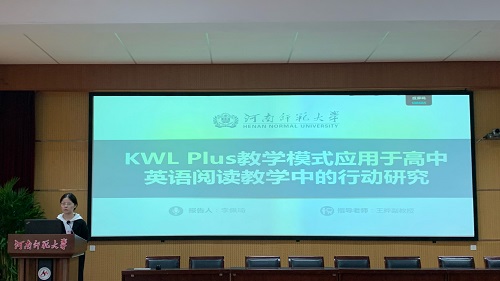 李佩琦同学以《KWL Plus教学模式应用于高中英语阅读教学中的行动研究》为题,探讨了KWL Plus教学模式在高中英语阅读教学中的应用及其对提高学生阅读成绩、阅读策略选择和使用以及思维品质的影响。她分享了KWL Plus模式的理论基础和实践方法,并采用行动研究法,综合运用多种研究手段,精心设计了研究步骤。李佩琦同学的研究强调了KWL Plus模式在激发学生好奇心和课堂积极参与方面的优势。