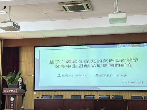 李华鑫同学以《高中英语语篇阅读中学生概括能力培养的行动研究》为题,分享了在高中英语教学中培养学生概括能力的重要性和实践方法。她指出,通过语篇阅读,学生能够提升提取关键信息、把握主旨大意的能力,这对于发展学生的综合语言运用能力至关重要。李华鑫同学的研究强调了以学生为中心的教学理念,提倡教师设计以语篇为核心的阅读活动,激发学生的主动学习和深入思考。
