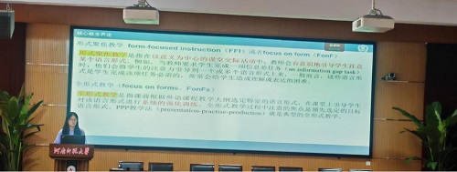 段潇迪同学分享了形式聚焦教学(FFI)在提升学生语言学习效果中的作用。她指出,通过在以意义为中心的交际活动中有意识地引导学生关注语言形式,可以有效提升学生的显性和隐性知识。她还引用徐锦芬教授等人的论文强调了在教学中识别和利用合适的形式聚焦时机的重要性。