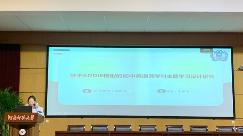 朱星宇同学聚焦《基于ADDIE 模型的初中英语跨学科主题学习设计研究》。因应跨学科需求,朱星宇以 ADDIE 规划路径。找准学情与融合点,如“环保”主题融合多学科知识设计项目。统整资源、流程与评价,以问题驱探索,用英语交流成果。实证明其扩视野、强应用、育素养,筑跨学科教学框架。
