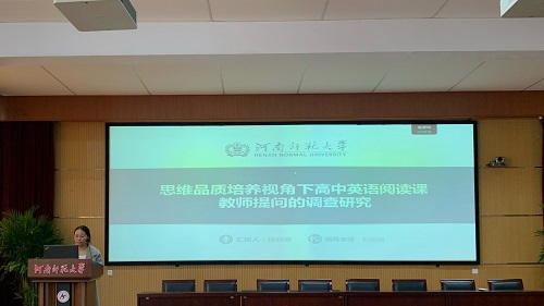 杨晓娜同学以《思维品质培养视角下高中英语阅读课教师提问的调查研究》为题,探讨了教师提问在高中英语阅读教学中的现状及其对学生思维品质培养的影响。她分享了思维品质和教师提问的核心概念,分析了教师提问在培养学生思维品质中的作用。研究设计部分确定了研究对象,采用问卷调查、访谈和课堂观察等方法,旨在调查教师提问现状,分析其影响因素,为提高教师提问质量,促进学生思维品质发展提供依据。