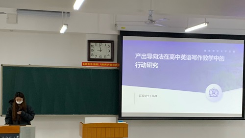 论坛伊始,8位研究生陆续分享了自己关于英语教学的研究成果和创新教学实践反思。邱冉同学分享了一篇名为《产出导向法在高中英语写作教学中的行动研究》的论文。她分析了高中英语写作教学的现状及产出导向法的适用性。基于此篇论文,邱冉同学回顾了国内外写作教学法的发展历程,阐述了产出导向法的理论基础、教学理念、假设和流程。在研究设计部分,邱冉同学详细说明了研究问题的确定、研究对象的选择,以及采用多种研究工具进行的三轮行动研究。每一轮研究都包括问题确认、计划制定、实施、评估和反思等环节,旨在全面探索产出导向法在高中英语写作教学中的有效性和操作流程。