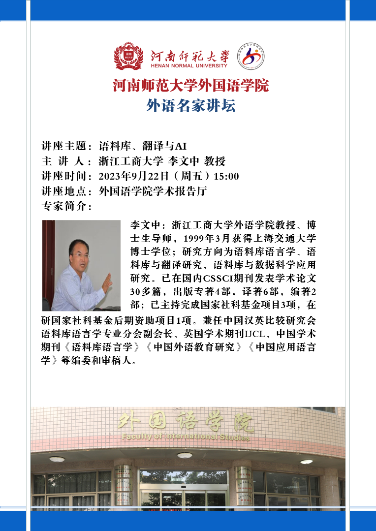 【预告】外语名家讲坛:语料库、翻译与AI 浙江工商大学 李文中 教授
