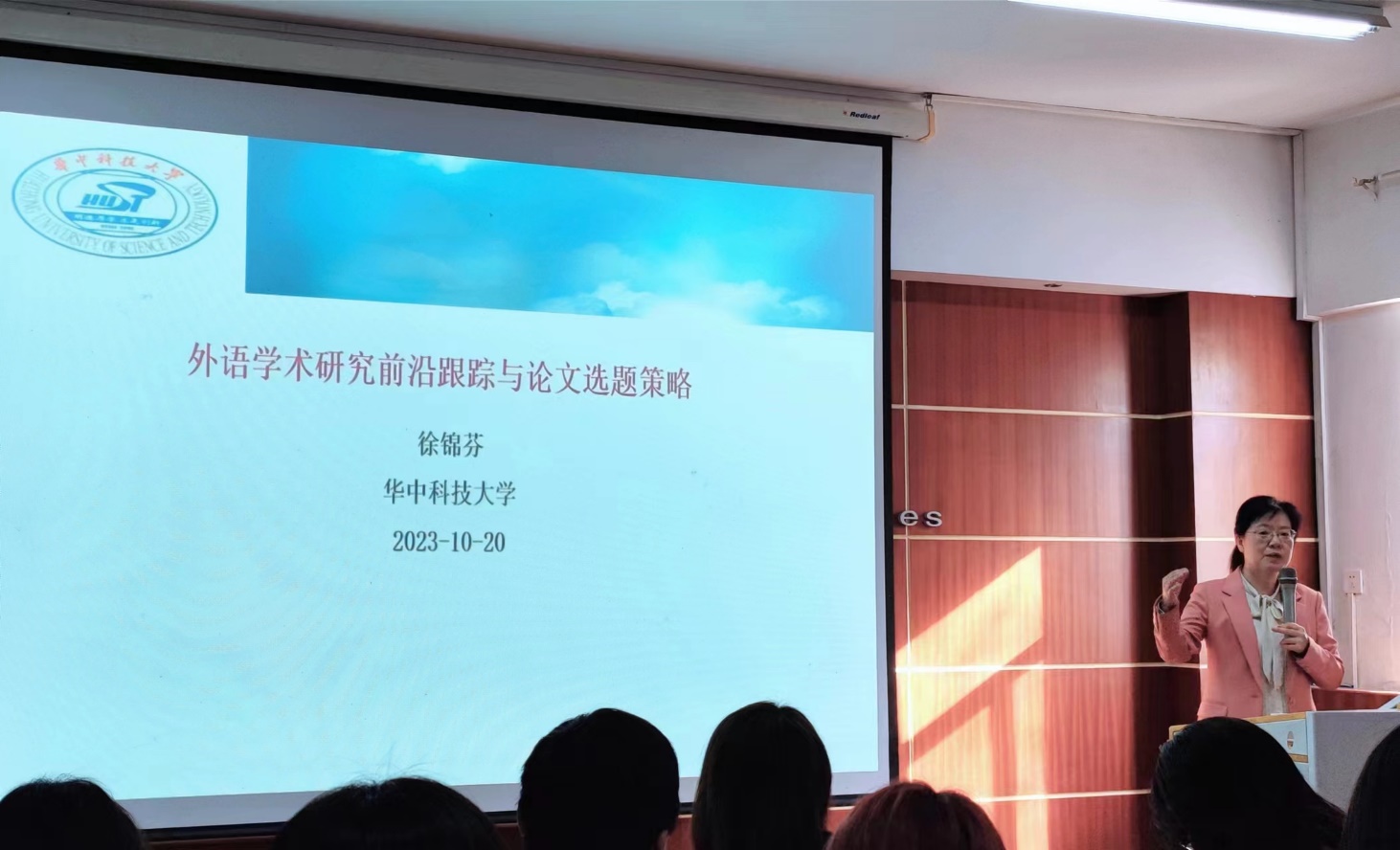 10月20日,应外国语学院邀请,华中科技大学徐锦芬教授在学院国培教室作了题为“外语学术研究前沿跟踪与论文选题策略”的学术报告,学院百余名师生参会聆听。外国语学院院长刘国兵主持报告。