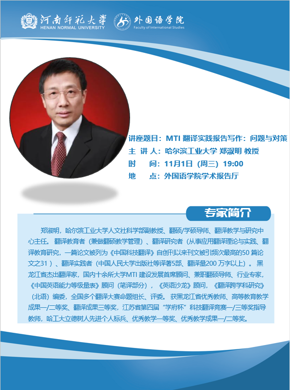 【预告】专家讲学:MTI 翻译实践报告写作:问题与对策 哈尔滨工业大学 郑淑明 教授