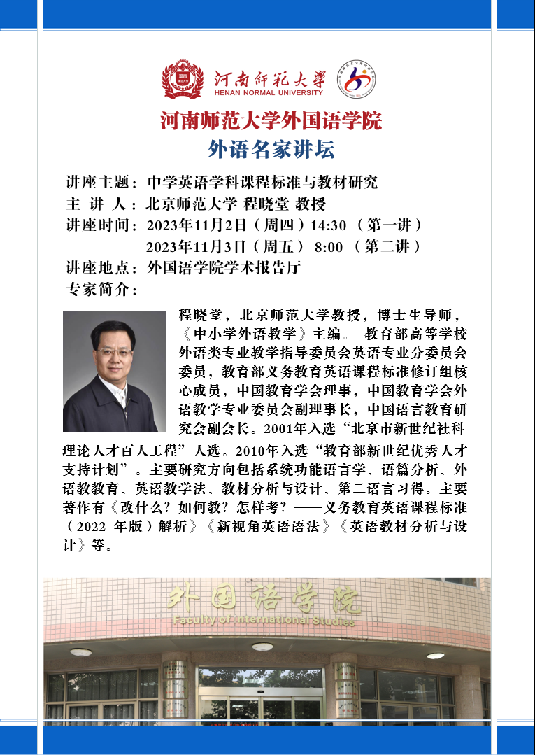 【预告】外语名家讲坛:中学英语学科课程标准与教材研究 北京师范大学 程晓堂 教授