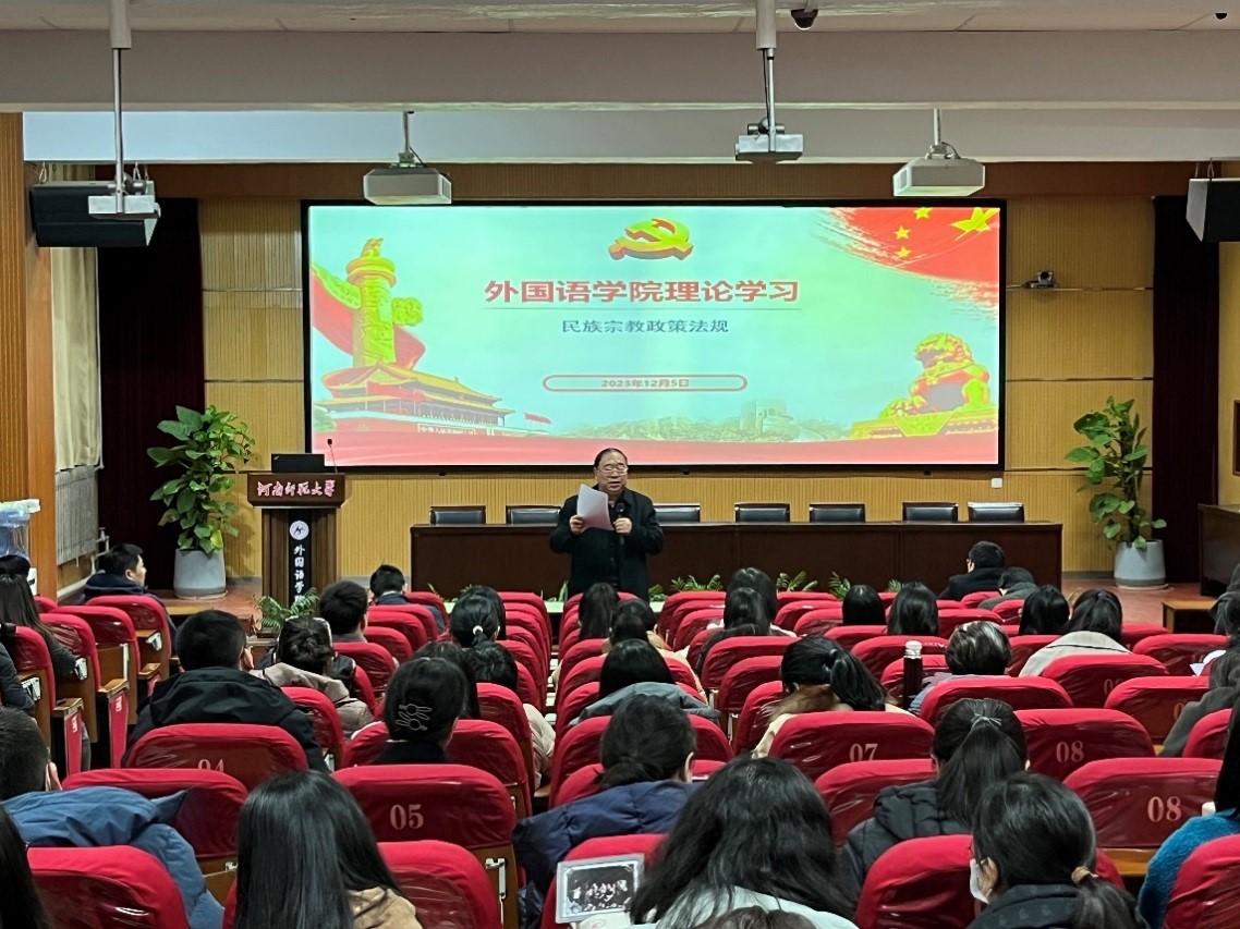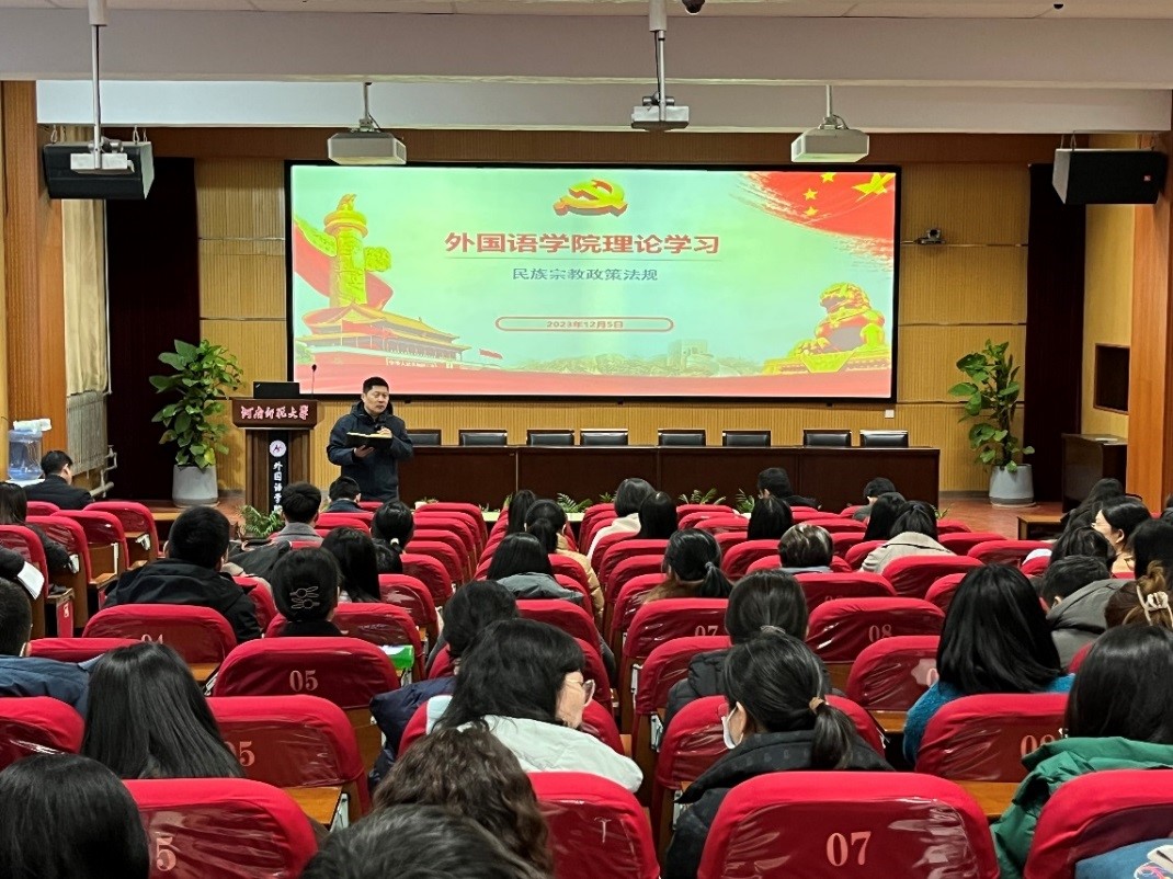 为深入学习贯彻落实党的民族宗教方针政策,铸牢中华民族共同体意识,12月5日下午,外国语学院在报告厅召开民族宗教政策法规理论学习会,学院全体教职工参加会议。