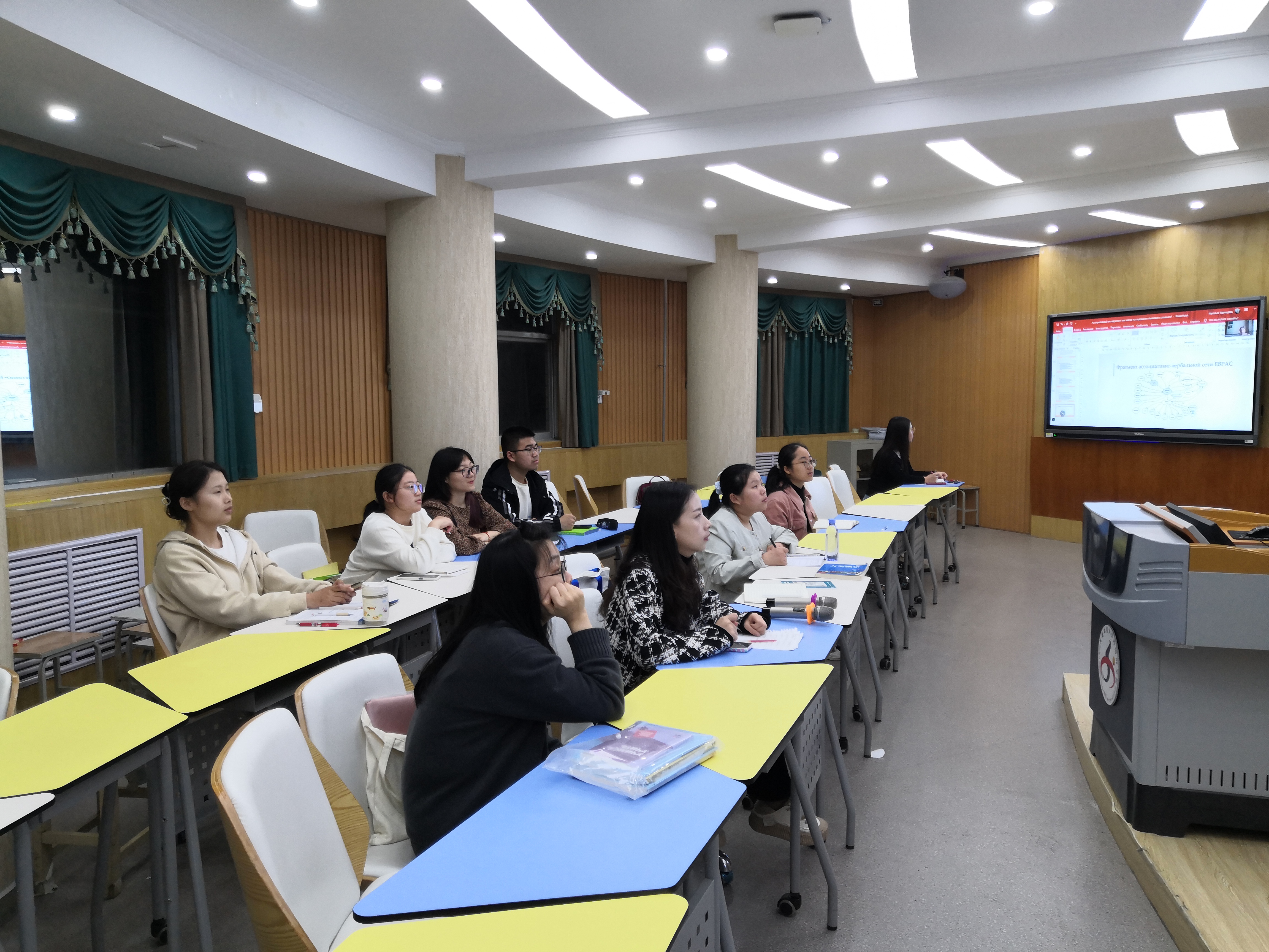 在第二场报告中,娜塔丽娅讲解了联想实验的心理学历史根源、实验方法和应用研究。她强调,联想实验是一种意识外化的手段,能够揭示受试者心理深处的联想网络。联想实验包括自由联想实验,定向联想实验及链式联想实验。其中,自由联想实验是俄罗斯心理语言学语言意识实证研究中最为常用的方法。该实验是被试基于主体个人认知、经验及社会文化影响基础上对刺激词最真实的反应。通过联想实验能够揭示某一民族和文化承载者的语言意识及其民族文化特点。