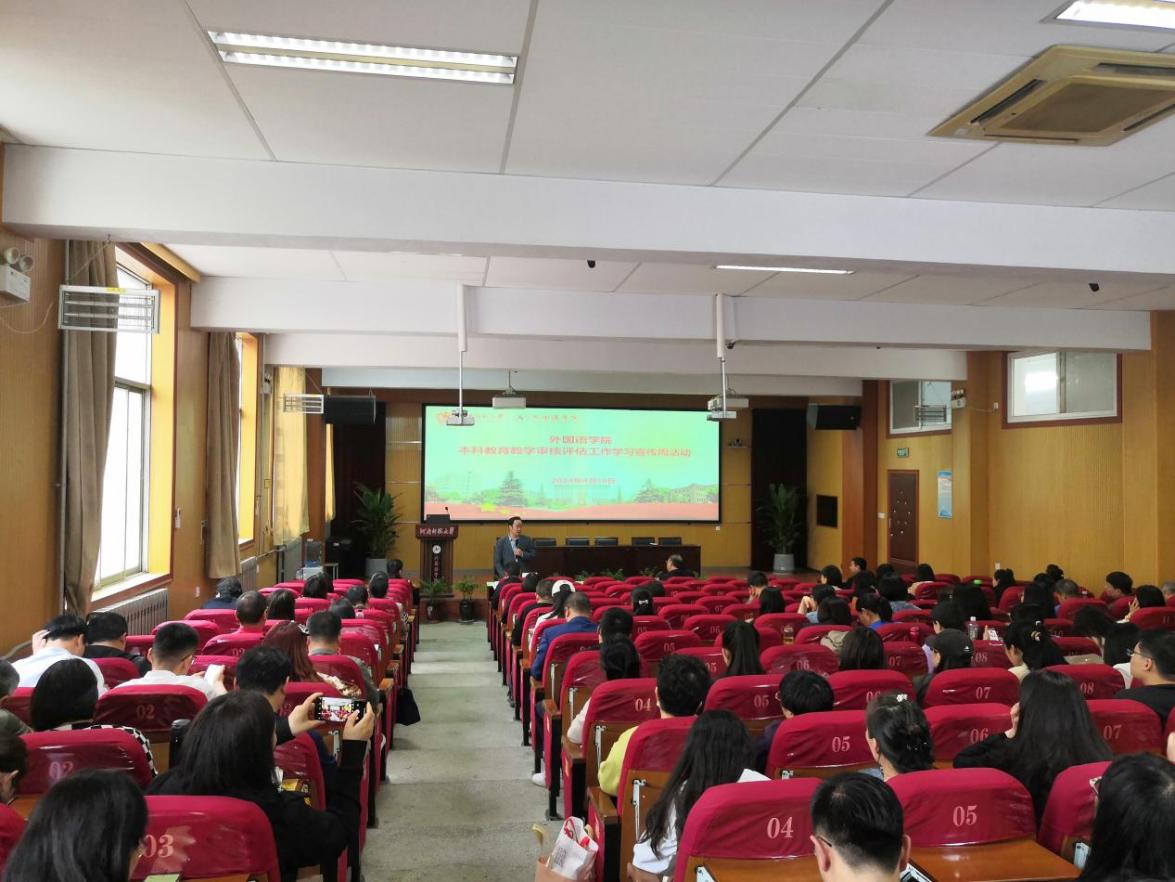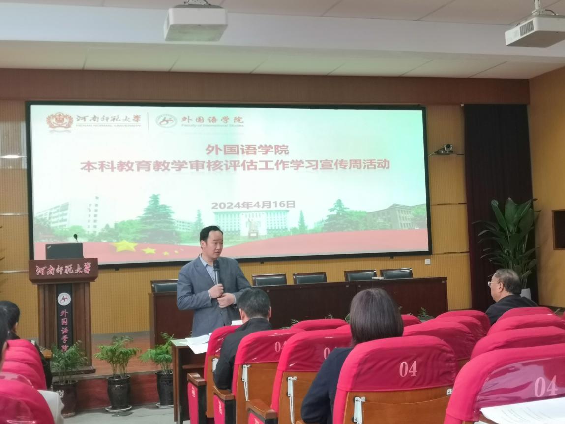 2024年4月16日下午,外国语学院在学术报告厅召开“本科教育教学审核评估工作学习宣传周活动”宣讲会。学院党委书记赵成福,副书记曹崇,副院长张军民、娄宝翠、王清杰、董亚杰以及全体教师参加。会议由赵成福主持,张军民宣讲。