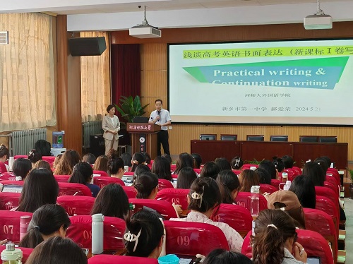 5月21日下午,应外国语学院邀请,中原名师、河南省特级教师、新乡市第一中学郝爱荣老师在外国语学院报告厅作了题为“浅谈高考英语书面表达”的学术讲座。讲座由张军民副院长主持,我院部分教师和教育硕士研究生100余人参会学习。