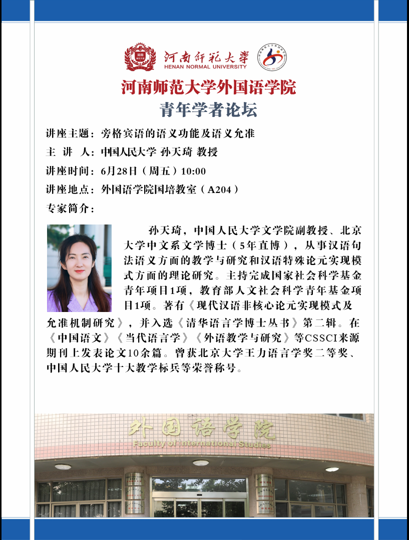 【预告】青年学者论坛:旁格宾语的语义功能及语义允准 中国人民大学 孙天琦 教授