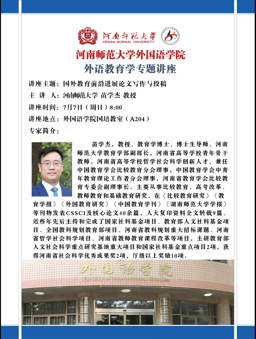 【预告】外语教育学专题讲座:国外教育前沿进展论文写作与投稿 伟德官网下载苹果版 苗学杰 教授