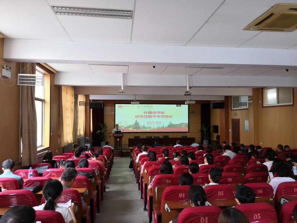 7月9日,外国语学院在学院报告厅组织召开研究性教学专项培训会,全体教职工参加。培训会由教学院长张军民、学校教学督导王晔主讲。
